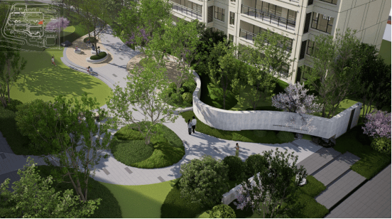 项目建筑密度仅21.5%,园林绿化面积约3.1万㎡,真正做到“将建筑点缀在园林中”,园林设计以“流动森屿”为主题,五进式院落,倾心打造中庭景观长廊为中轴,两侧延伸景观组团,贯穿社区南北的、凉亭、绿岛、儿童活动区、环形600米“慢跑”系统等众多景观点缀,使整个小区大气灵动;项目所使用景观树种均为全冠移植,五重造景层次丰富,呈现完美的四季表达,以小区大门水体景观为引领,坡地绿化造景为主体。让使整个社区彰显出浓郁原生态山水园林韵味。