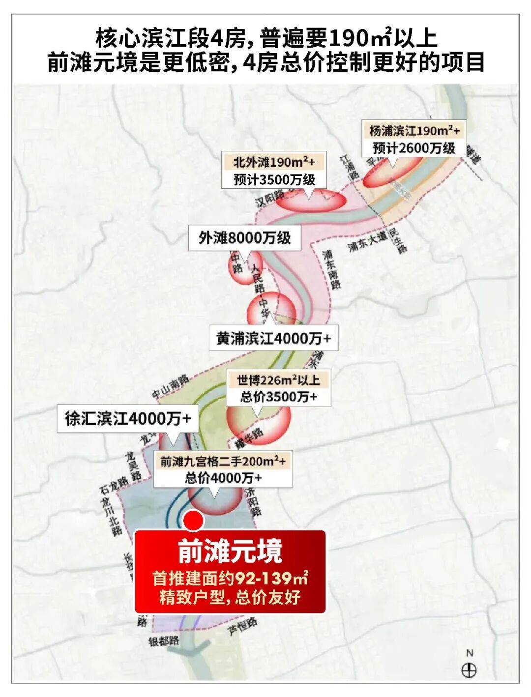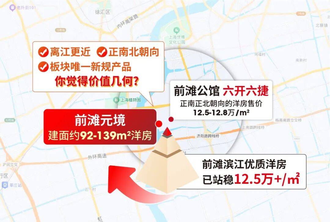 这段江是黄浦段,价值已在新房市场强势兑现。对岸徐汇滨江房价冲击20万/㎡;前滩商务区二手房坚挺,前滩滨江的前滩润璟、百合园、前滩公馆等连开连捷,片区楼市热度居高不下。