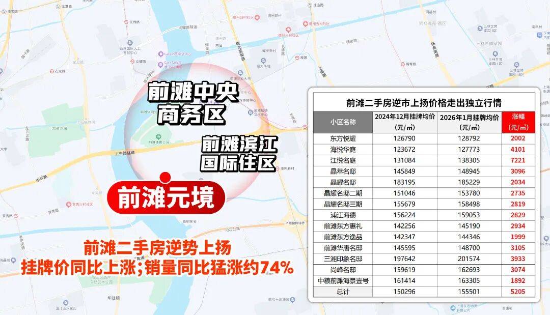 2025 年市场答卷,更印证了前滩的硬核实力:在全市约98%板块挂牌价同比下行的环境下,前滩多数小区依然价格坚挺、抗跌性突出;成交量上,前滩同比大涨约74%,市场吸引力遥遥领先。