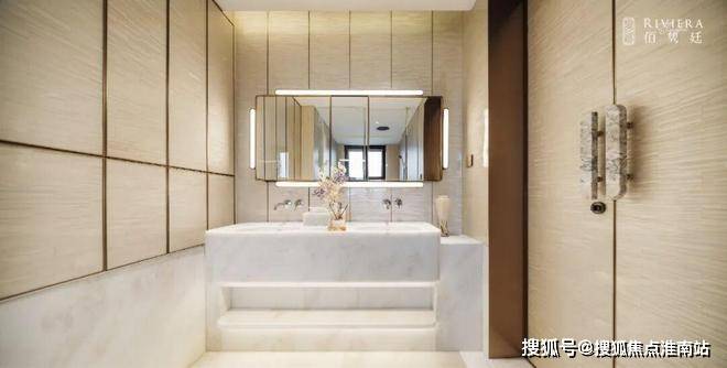 阳光满溢,尤其主卫罕见实现朝南采光,搭配奢华的双台盆、马桶间、浴缸与淋浴的“四件套”配置,尽显高端居住品质;