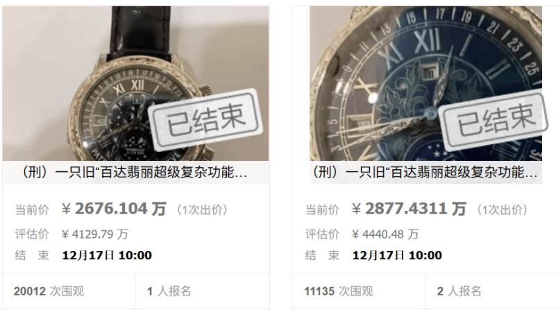 该别墅并非中科创系唯一涉案处置资产。与别墅持续流拍形成对比的是,同属涉案资产的两块百达翡丽超级复杂功能时计系列腕表,在12月17日的第五次拍卖中顺利成交,分别以2676万元和2877万元的起拍价拍出,合计成交额超5500万元。