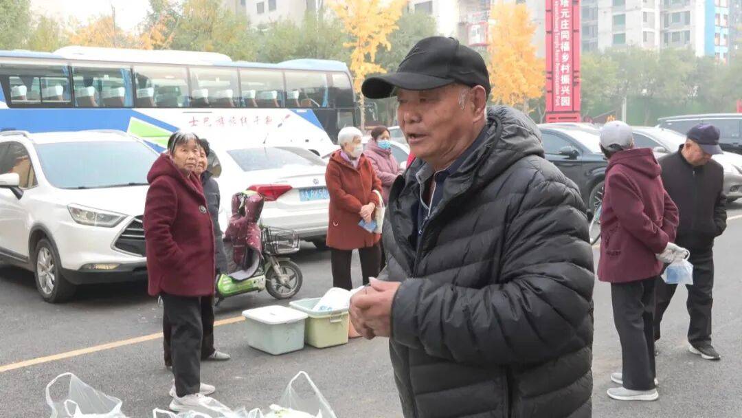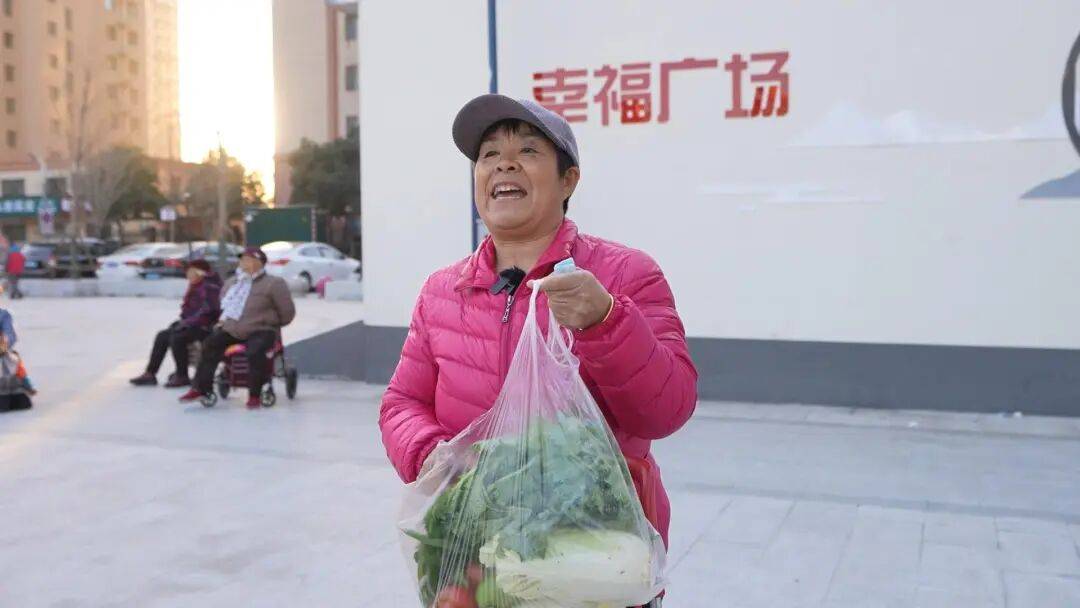 记者采访当天是塔元庄每周一次的分菜日。这是塔元庄村雷打不动的“幸福日程”。村里人拉上小车、提上袋子,早早地来到广场,排队领菜。