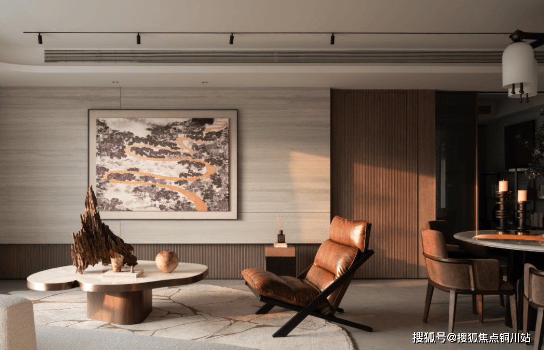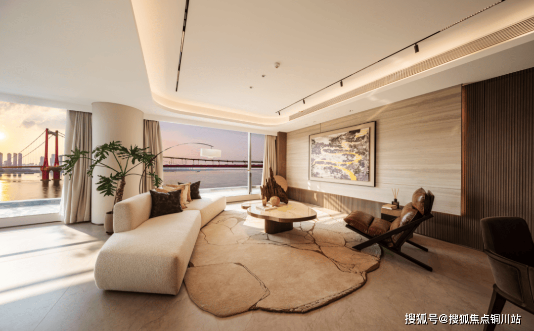 千层岩纹理的大面岩板背景墙,纹理与窗外长江相呼应;再加上电视背景墙隐藏式插座,让墙面体验更加无瑕疵……