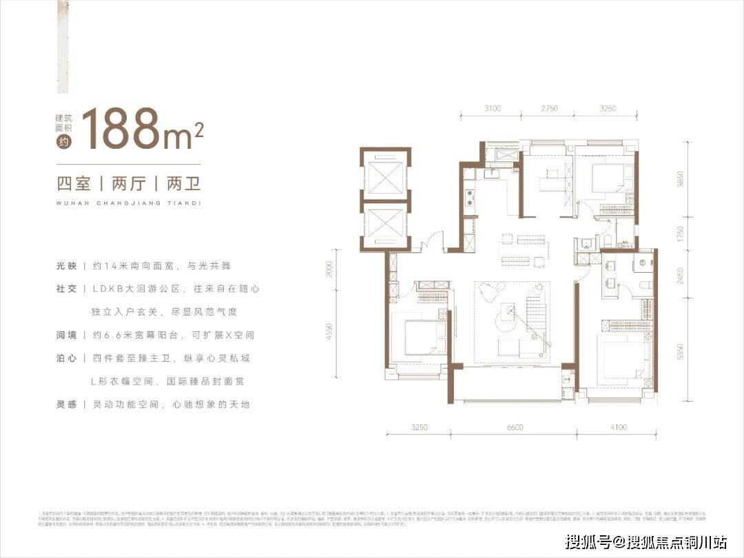 该户型南北通透,三开间朝南,客厅约6.6米的超大开间与“跑道式”阳台,南向约14米大面宽,武汉天地同款入户装甲门,室内空间感拉满;