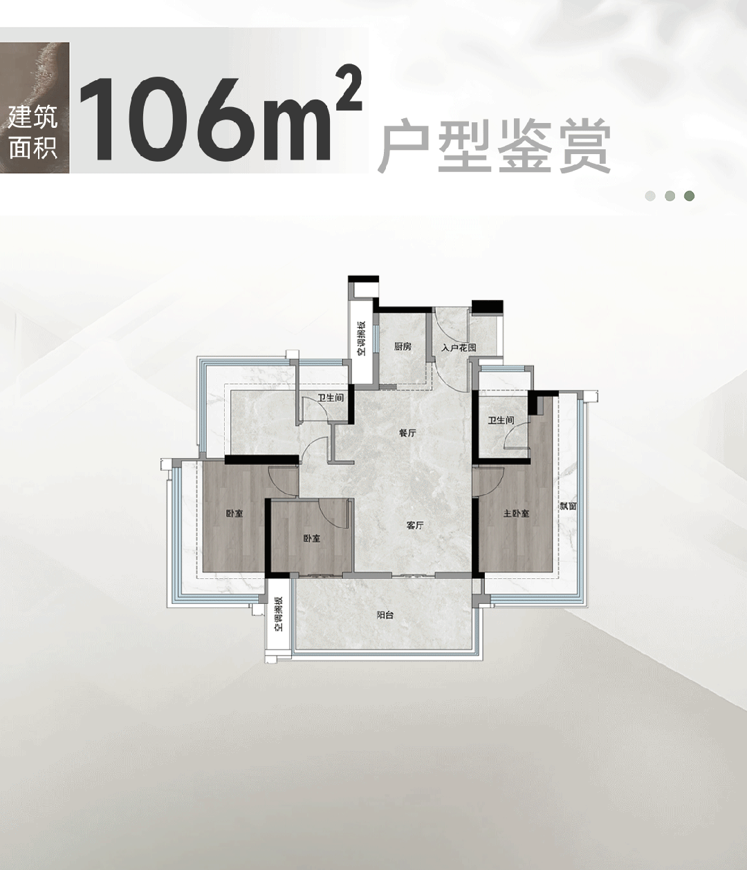106㎡户型是本次加推中最受追捧的“鼻子户”。该户型位于整栋楼的凸出位置,呈三面单边设计,基本无遮挡,视野极其开阔。东南朝向的设计,使得高层住户能够一览无余地欣赏白云山的壮丽景色。主卧与次卧均配备了L型飘窗,甚至带有阳台,极大地延伸了室内空间感。其独特的“凸出”结构,让每一户都能享受到充足的阳光和清风,真正实现了“户户看景”。对于追求景观资源的改善型客户来说,这是不可多得的选择。