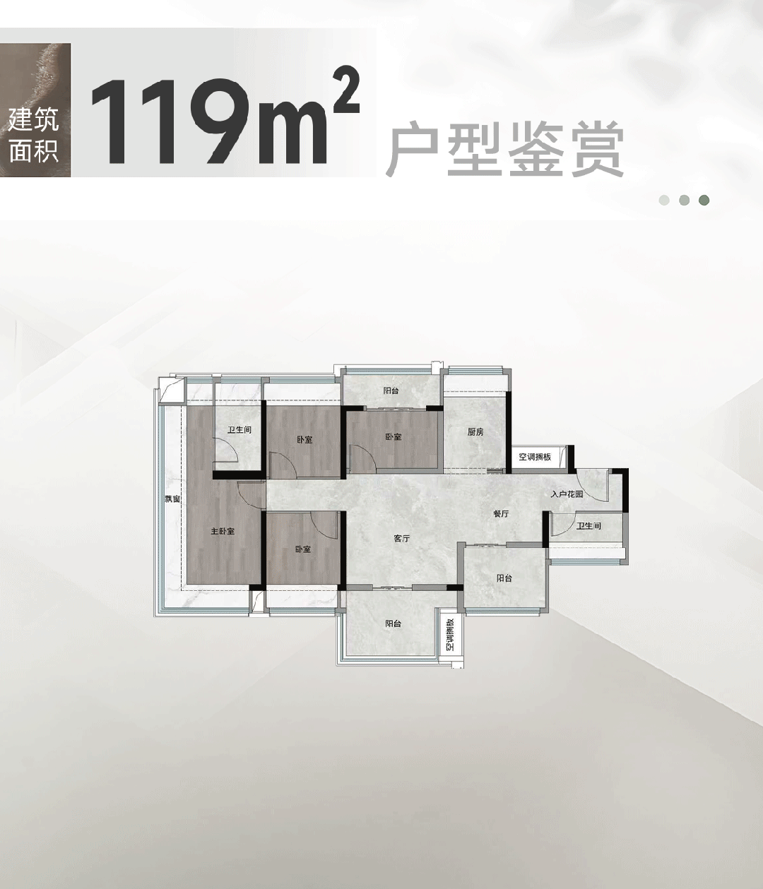 119㎡户型则主打西南望城景,相对靠近小区内部,环境更为安静。该户型做到了五开间朝南(含卫生间采光),整体采光通风效果极佳。主卧面积宽绰,U型的采光面设计,营造出一种酒店式的尊贵感。客厅与餐厅的连通设计,使得公共活动区域显得格外大气,非常适合大家庭聚会或日常社交。