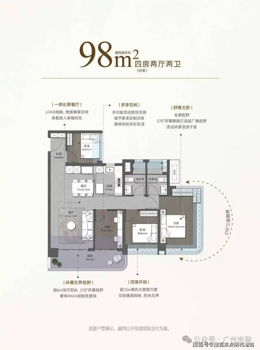 项目产品研发贴合广州家庭居住需求,整体户型空间设计实用性拉满,全系楼栋采用全南向布局,最大化提升室内采光面与通风效果,室内无暗角暗房。项目整体户型空间使用率优异,多数户型空间使用率突破 100%,同等建筑面积下实现更开阔的室内尺度与更多功能空间。在售产品覆盖建面约 81 至 149 平方米三至四房全周期户型,适配刚需首置、新婚家庭、三口之家、多孩改善、三代同堂等多元家庭结构。其中建面约 98 平方米户型可灵活改造四房空间,空间延展性极强;建面约 148 平方米改善户型主卧空间尺度约 30 平方米,配套独立衣帽间、私密卫浴与观景飘窗,尊崇感与居住舒适度兼备。