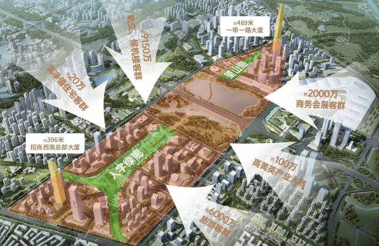 天府新区总部商务区“以人字绿廊串联西南第一高楼489米一带一路大厦及396米招商西南总部大厦”