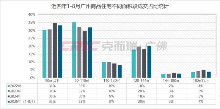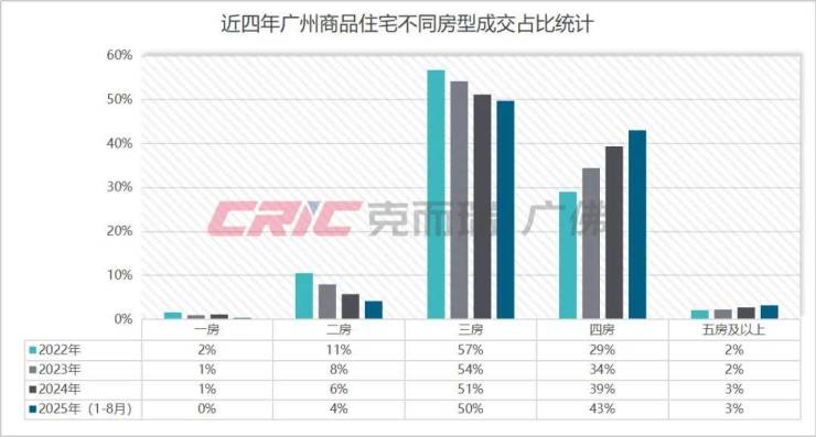 据克而瑞监测,2025年1-8月,广州新房市场中,三房产品共成交20075套,占比达50%,牢牢占据总成交的半壁江山;四房及以上户型表现同样亮眼,成交18407套,占比高达46%,较去年同期增长5%,涨势显著。